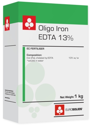 Eurosolids Oligo Iron-EDTA 13% is a 100% chelated single micronutrient fertilizer of high purity. Thanks to the unique cluster-shaped microgranule, it is completely dust-free, flows easily, and dissolves quickly. With its porous structure, the microgranule bursts from the inside out, leading to faster dissolution even in cold or hard water. Our product is not sensitive to caking in normal storage conditions. It is recommended to cure Iron deficiency in all crops.