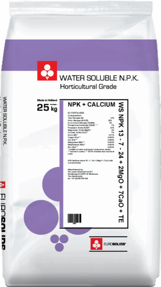 Eurosolids WS NPKs are top quality blends made from the purest raw materials, with limited caking sensitivity and with high level EDTA-chelated micro-nutrients for fertigation or foliar application. Eurosolids WS NPK | 13 - 7 - 24 + 2MgO + 7CaO + TE is part of our NPK Calcium line. Our NPK Calcium line offers unique formulas combining the same high quality NPKs with readily available Calcium for the crops. This line especially addresses fertigation using rain water, offering a complete rich and efficient solution. As Nutrient Use Efficiency remains our main concern at Van Iperen, we try our best to come with adequate solutions for all situations.