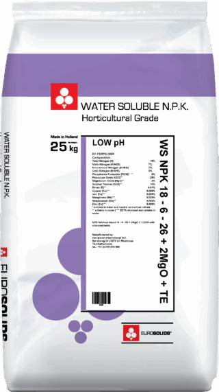 Eurosolids WS NPKs are top quality blends made from the purest raw materials, with limited caking sensitivity and with high level EDTA-chelated micro-nutrients for fertigation or foliar application. Eurosolids WS NPK | 18 - 6 - 26 + 2MgO + TE is part of our Low pH line. Our Low pH line was developed using specific acid technology that will drop the pH of the final product. This gives the formulation an increased efficiency in alkaline waters thanks to the buffering of bicarbonates with acid, for higher plant assimilation of all elements including micro nutrients.